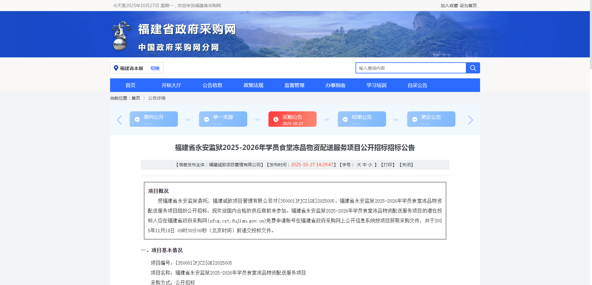福建省永安監獄2025-2026年學(xué)員食堂凍品物資配送服務(wù)項目公開(kāi)招標招標公告