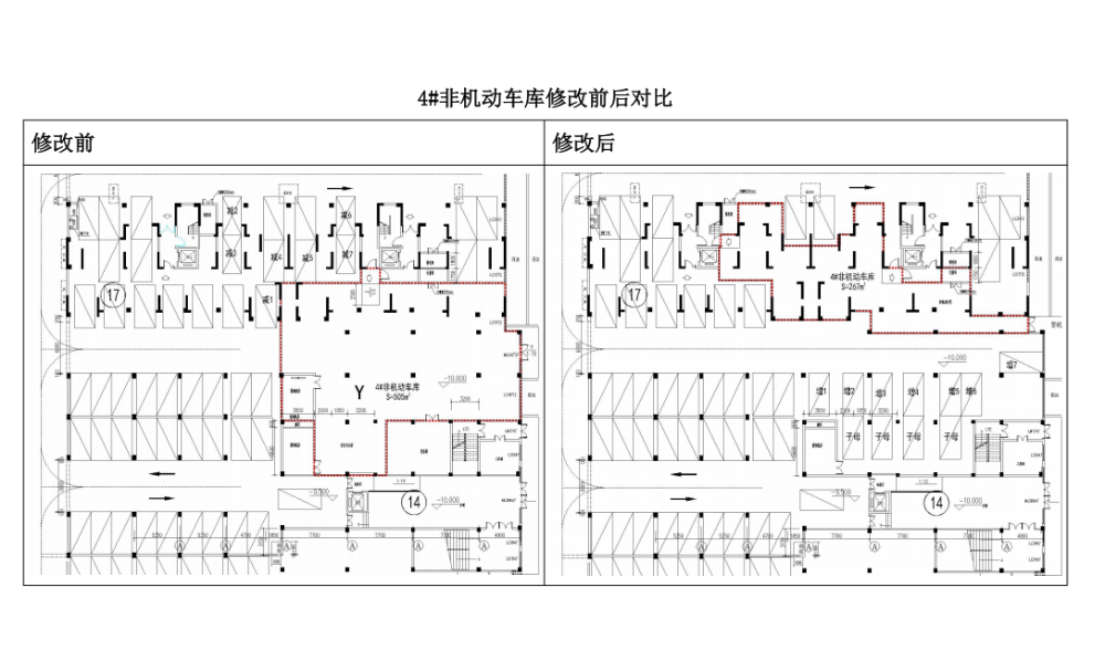 2.4#非機(jī)動(dòng)車(chē)庫(kù)調(diào)整。4#非機(jī)動(dòng)車(chē)庫(kù)規(guī)劃面積505㎡,位于14#社區(qū)服務(wù)用房與17#住宅樓地下,因14#與17#樓之間地庫(kù)存在結(jié)構(gòu)柱網(wǎng)密集、通行流線交叉等問(wèn)題,部分區(qū)域因空間狹窄難以有效利用,且社區(qū)用房機(jī)動(dòng)車(chē)位緊缺?,F(xiàn)調(diào)整至17#住宅樓地下一層,非機(jī)動(dòng)車(chē)庫(kù)出入口相應(yīng)北移,面積減少為259㎡(減少面積在3#非機(jī)動(dòng)車(chē)庫(kù)區(qū)域補(bǔ)足)。原17#樓地庫(kù)機(jī)動(dòng)車(chē)位配置1個(gè)普通車(chē)位 4個(gè)子母車(chē)位,調(diào)整后為?3個(gè)普通車(chē)位 4個(gè)子母車(chē)位。